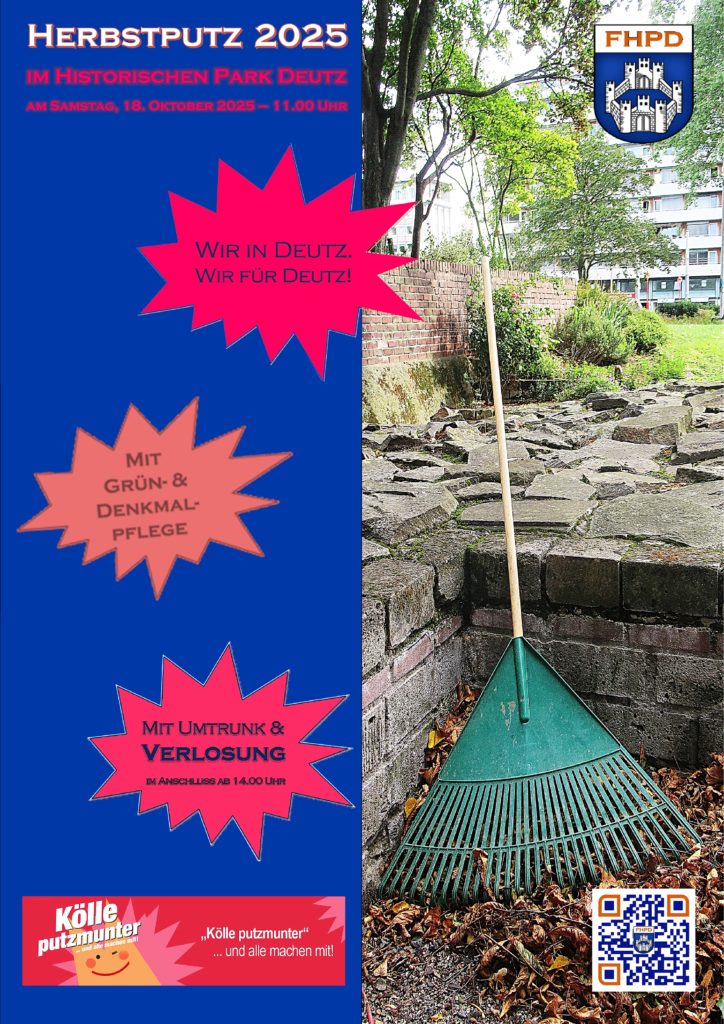 Warum machen wir das? Damit im Historischen Park Deutz zum Abschluss der Saison noch mal ordentlich aufgeräumt wird und sich auch im Herbst alle Besucherinnen und Besucher über eine gepflegte Parkanlage freuen, wenn Sie auf Spurensuche nach der UNESCO-Welterbestätte Kastell Divitia und der anderen historischen Orte im Historischen Park sind. Damit wir alle Freude daran haben, machen auch Sie mit! Wir treffen uns um 11 Uhr am Pavillon vor dem Eingang zum Gewölbekeller (gegenüber der Straßenbahnhaltestelle 1/9 Deutzer Freiheit). Als kleines Dankeschön gibt es nach getaner Arbeit ab 14 Uhr einen kleinen Umtrunk und eine Verlosung!